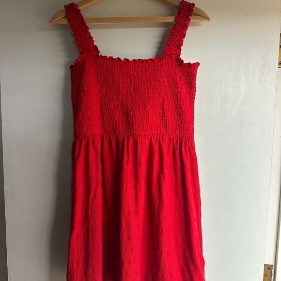 Vibrant red sleeveless dress with smocked bodice. Perfect for casual outings. Worn once. Great condition.