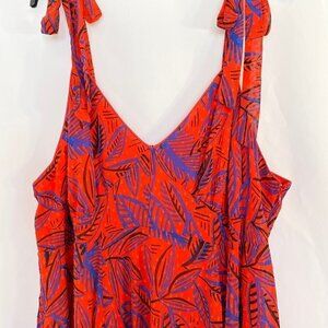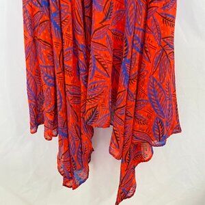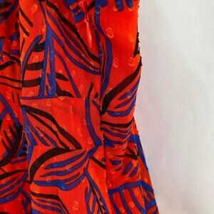 Red & Royal Blue Tropical Leaf Summer Flare Sleeveless Dress...asymmetrical hemline...smocked back for give and form fit...zipper on side...solid red lining...flowy material... dressy party evening dance wedding nighttime...see photos for details...052822