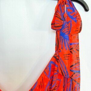 Red & Royal Blue Tropical Leaf Summer Flare Sleeveless Dress...asymmetrical hemline...smocked back for give and form fit...zipper on side...solid red lining...flowy material... dressy party evening dance wedding nighttime...see photos for details...052822