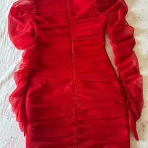 Turn heads with this stunning red ruched bandage dress. Perfect for any occasion, its elegant design and vibrant color make it a must-have in your wardrobe. Last picture is a reference of how it kind of looks the dress on, it’s not the actual dress.