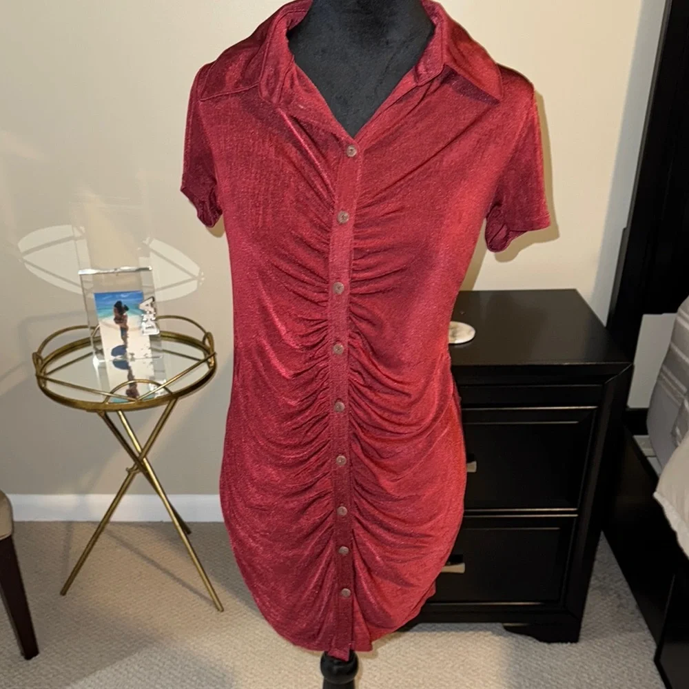 Stylish red ruched dress with button-up front. Short sleeves and collared neckline.