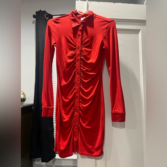 Red Ruched Button-Up Dress