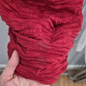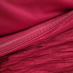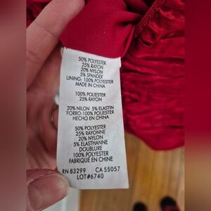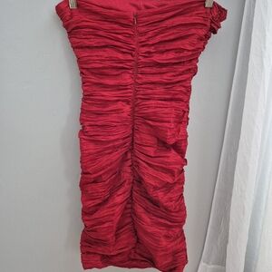 Red bodycon cocktail dress, with ruffle neckline and ruched detailing. hidden zipper in back, dress is cinched towards the back in a seam (see pics). small stain in front of dress (see pics), did have dry cleaned but I think they missed it. size 7/8 in juniors. Elastic lined on top to hold dress up. kept in a dress bag!