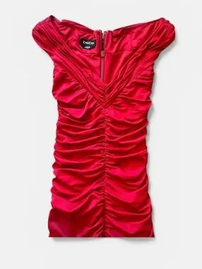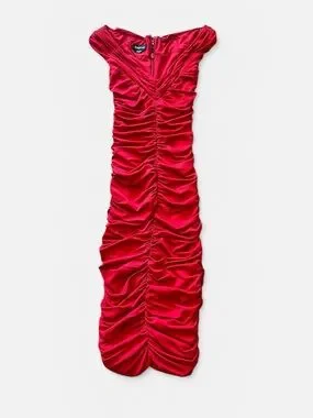 Bebe Red Ruched Midi Dress. Fitted ruched dress in vibrant red. Off-shoulder neckline with gathered detailing down the front. Sleek, bodycon silhouette for evening wear.