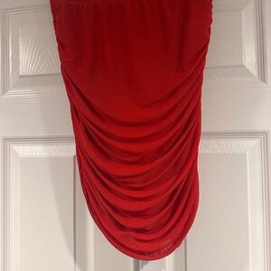 Bold red skirt with dramatic ruched draping. Soft, flowing mesh fabric. Elegant silhouette for evening or special events.
