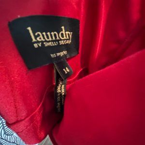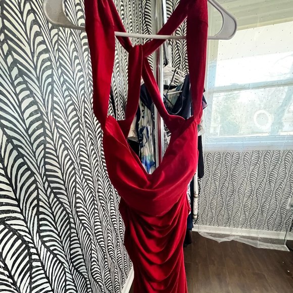 Dress is true red, midi length, stretchy, halter, cross straps, form fitting, bodycon, dressy