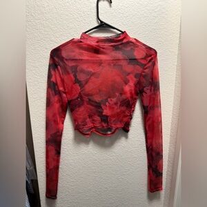 Stylish red ruched mesh crop top with long sleeves.