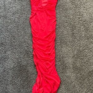 Stunning red ruched maxi dress. Perfect for elegant occasions.