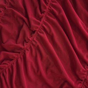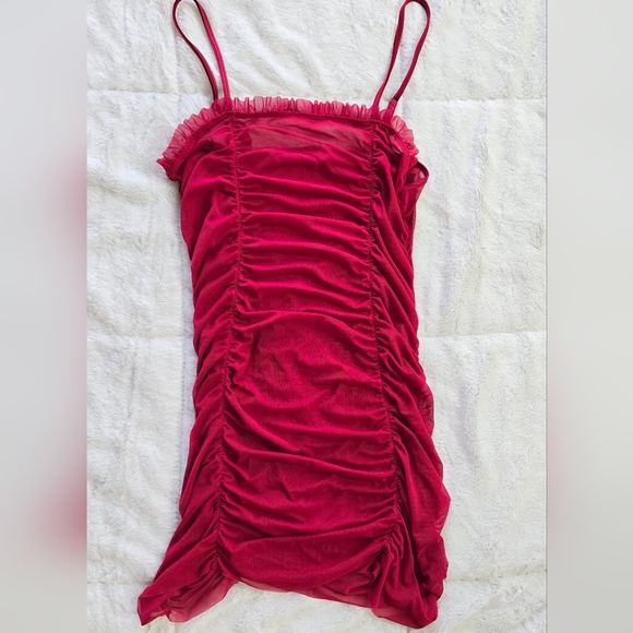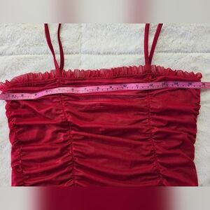 Fitted ruched chemise with spaghetti straps. Soft stretch mesh fabric with gathered detailing down the front. Bold red color.