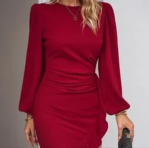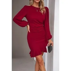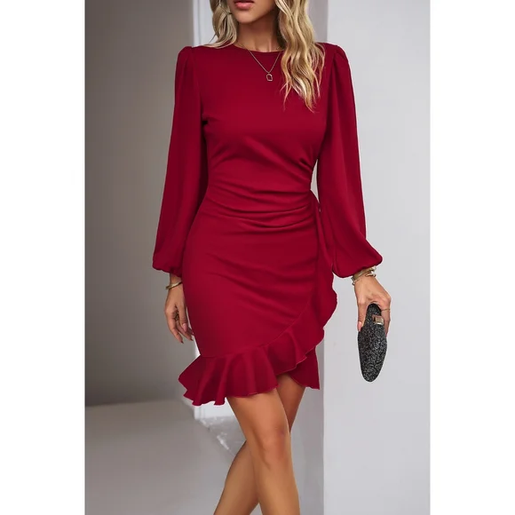 A striking red Ruched Ruffle dress that effortlessly combines sophistication with a touch of playfulness. The ruched detailing accentuates your silhouette, while the ruffles add a feminine and dynamic flair. This dress is a bold choice for any special occasion, making a statement with its vibrant color and stylish design.