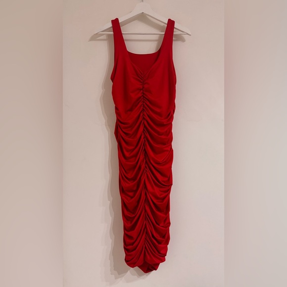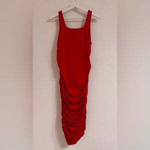 Elegant red sleeveless dress with a gathered ruched front for a flattering silhouette. Soft drape and sleek finish create a polished look for evening or special events. Easy-to-style design that highlights the red color.
