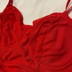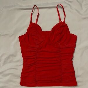 Vibrant red sleeveless top with ruched detailing. Perfect for a bold look.