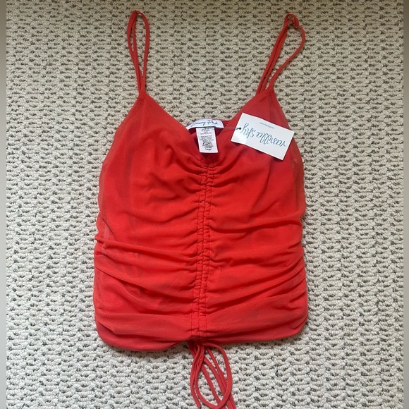 Red ruched top perfect for going out or a casual event. Size large but runs a bit small with some stretch. Fits sizes S-L. Pretty dark orange/ coral color!