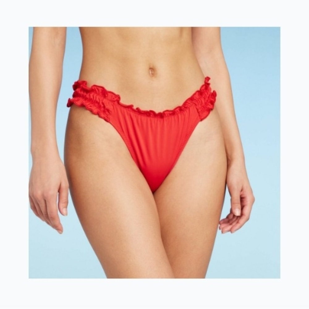 #003500 Stylish red bikini bottom with ruffle details. Perfect for a beach day.