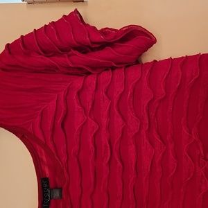 Red Ruffle sort sleeve blouse by forever fashion. Approximately 19 inches in length from the neckline in front and 23 inches from the neckline in back. Ruffles in front and back of blouse.