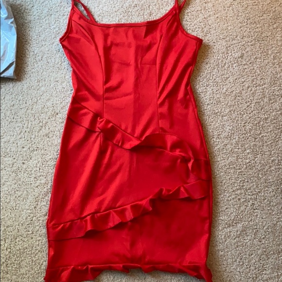 Red fitted dress with ruffles and spaghetti straps, looser fitting
