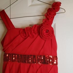 Red Ruffle dress by My Michelle. Flower detail along left strap. Sequin waist. Vertical Ruffled skirt. Fun dress for any girl! Pull on style with tie in back. Great condition.