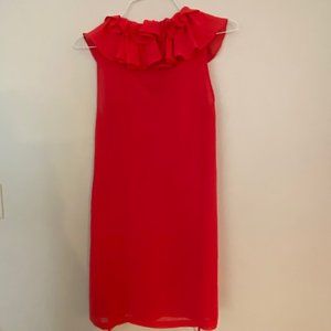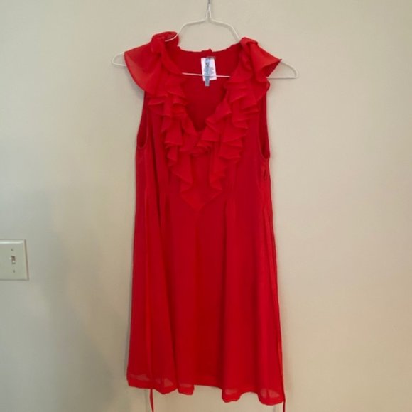 Bright red ruffle dress. V-neck ruffle along the neckline. Small tie in back. Zipper on side. Light, flowy materialy. 100% polyester.