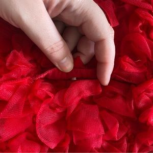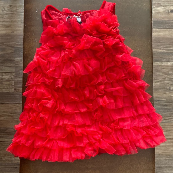 9-12 month red ruffle dress with velvet detail. Gently used. Button back. Mud pie Brand.
