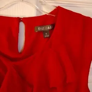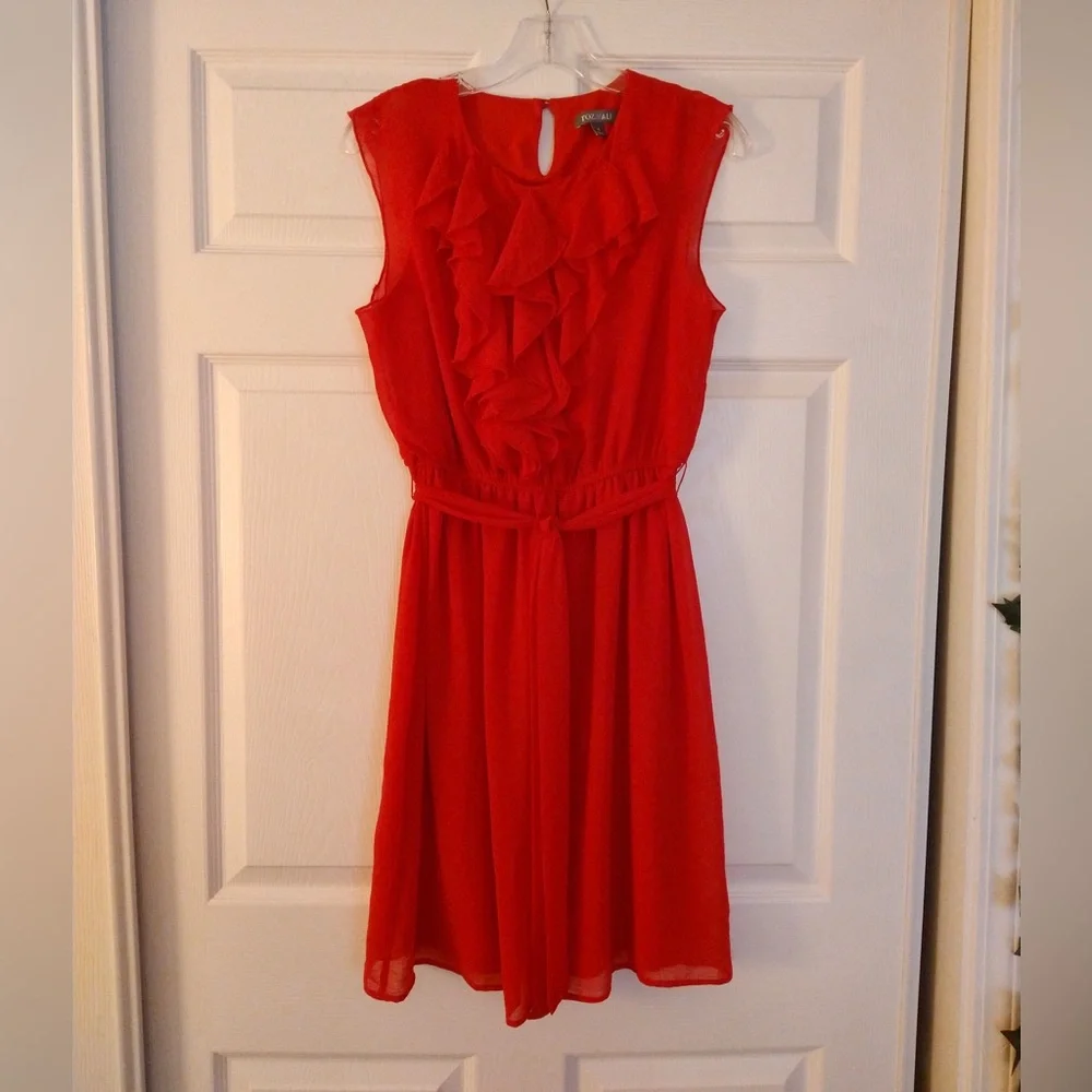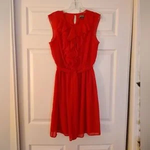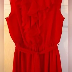 Red chiffon-like sleeveless dress with ruffle details. Elastic waist and tie sash. Size:6