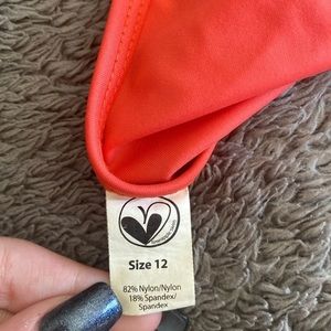 Super cute 2-piece swimsuit with ruffled flowers on both pieces. The top has ties for behind the neck and the band. The bottoms have cinch sides that can be made tighter or looser to change the look. Size 12 in girls