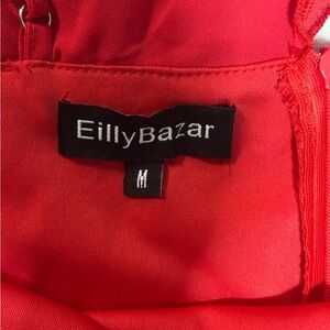 Elegant red high-low dress with feminine ruffle detailing. Lightweight, flowing fabric creates graceful movement. Adjustable straps and off-shoulder ruffle neckline for a flattering fit. Perfect for special occasions and evening events.