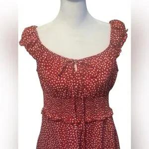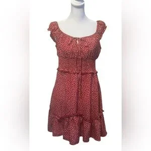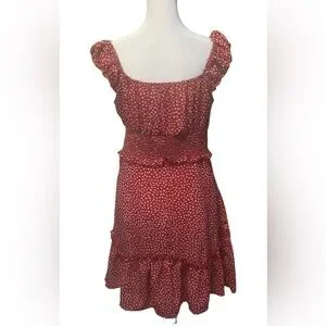 Chic and flirty red mini dress with an allover white dot print. Features a smocked waist for a flattering fit, ruffle cap sleeves, keyhole tie neckline, and tiered ruffle hem. Lightweight and easy to style for casual outings, date nights, or layered with a jacket.