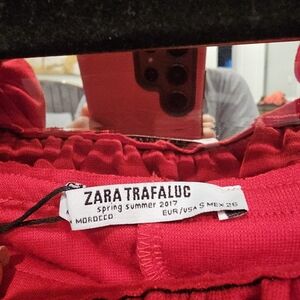 Elegant red dress with a ruffle neckline. Perfect for any occasion.