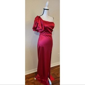 Red ruffle one shoulder special occasion formal satin maxi dress features back zipper closure, high side split, built in padded bust