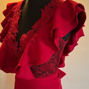 Elegant red romper with ruffled flutter sleeves. Plunge neckline with underlay lace. Zip back. Detached belt. It’s actually a very stunning and flattering piece.