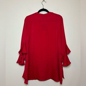 Red button down V-neck blouse with ruffle 3/4 sleeves.