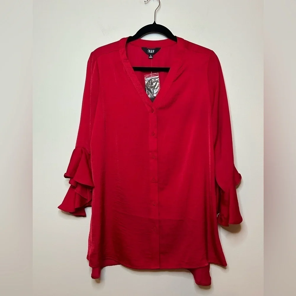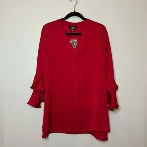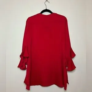 Red button down V-neck blouse with ruffle 3/4 sleeves.