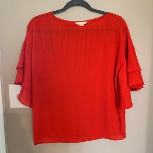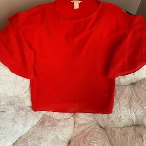 Size 4, H&M Red Top - Bell shaped, Ruffle sleeves hit around mid-arm. Polyester. Worn once, no flaws. Material has slight visibility - can see if dark color underneath.