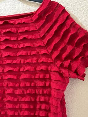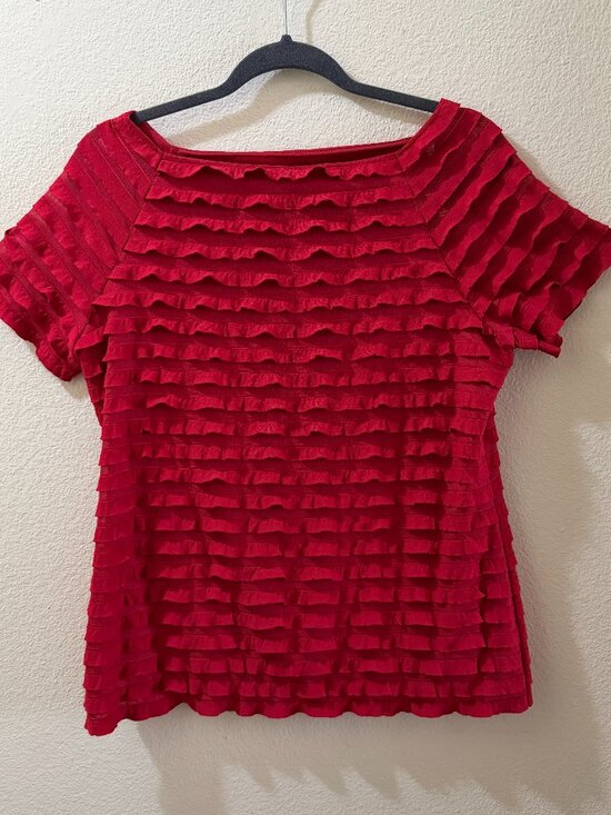 Bright red top with allover ruffle texture and short sleeves. Soft, stretchy feel with a flattering, slightly fitted silhouette. Perfect statement piece for dressing up or adding a pop of color. No tag, but it fits like a L.