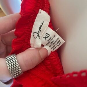 This vibrant red ruffled top is perfect for any occasion. Its stylish design adds a touch of elegance to your wardrobe.