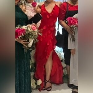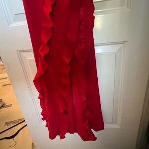 Elegant red slip maxi with cascading ruffle trim. Lightweight, flowing silhouette for evening and special events. Adjustable spaghetti straps for a custom fit. Bold red color adds instant glamour.
