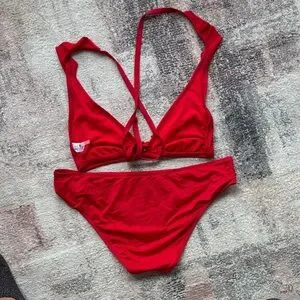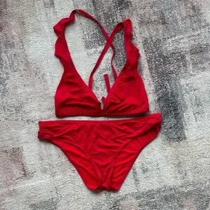Stylish red bikini set with ruffled details. Perfect for a day at the beach or pool.