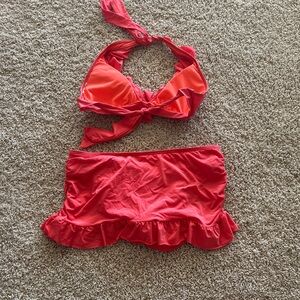 Stylish coral bikini set with ruffled details. Perfect for the beach.