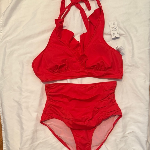 Stylish red bikini set with ruffled details. Halter neck design. High waited