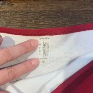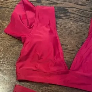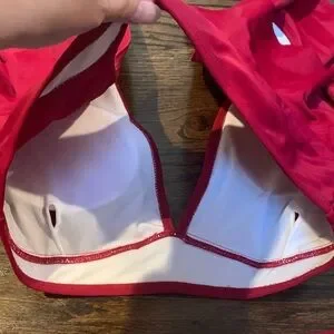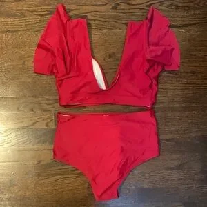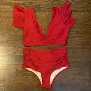 Stylish high waisted red bikini set with ruffled shoulder detail. Perfect for beach days.