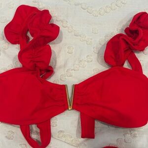 Stylish red bikini set with ruffled straps and a bow detail. Perfect for a beach day. Could purchase as a set or top/bottoms separately.