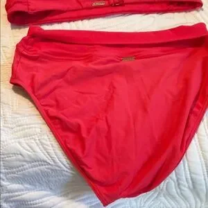 Stylish red bikini set featuring a ruffled top and high-waisted bottoms. Perfect for a chic beach look.