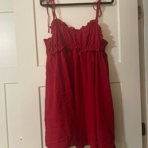 Chic red dress with ruffled details and adjustable bow spaghetti straps and ruched back for the perfect fit. Approximately xl size. Perfect for a casual outing or a summer day. Like new condition.