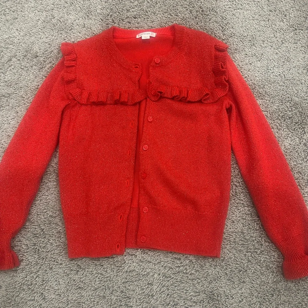 Stylish red cardigan with ruffled details. Perfect for layering.