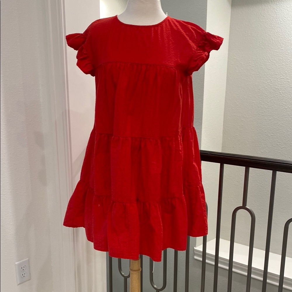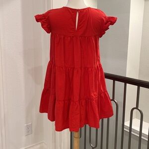 Bright and cheerful, this red ruffled dress is perfect for any occasion. Comfortable and stylish, it's a must-have for your wardrobe.