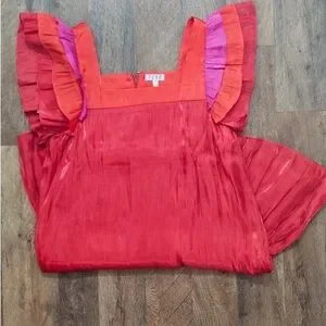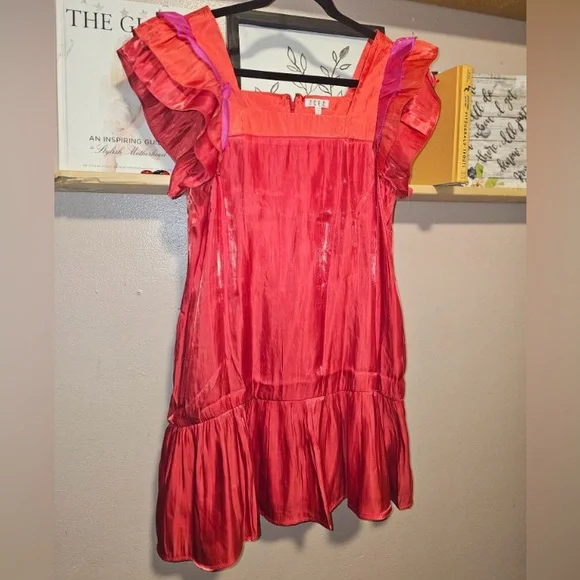 Vibrant red dress with ruffled sleeves. Perfect for a bold statement.