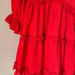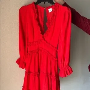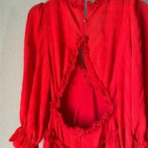 Turn heads in this gorgeous red dress featuring elegant ruffles and a subtle open back slit. Dress it up with heels or go for a more casual look with boots — it’s versatile and effortlessly chic!