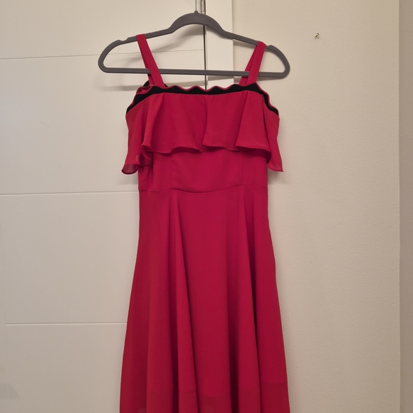 size xs. above knee length.red dress with ruffle details.