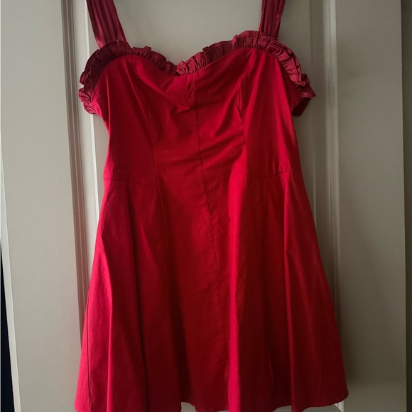 Vibrant red mini dress with sweetheart neckline. Ruffled trim along bust and straps. Flared skirt for a playful silhouette. Simple and stylish for daytime or date nights.