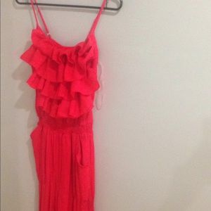 Pretty, red, ruffled jumpsuit. Very light lien material. Be ahead of that game next Valentines Day!